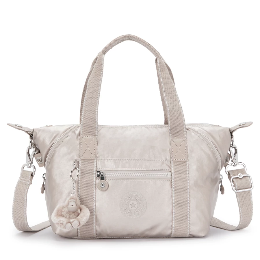 Két kézifogó / levehető, állítható vállpánt / cipzáras rekesz / külső cipzáras és nyitott zseb / oldalain lévő cipzárral és patenttal variálható fazon / belső cipzáras zseb / egyéb rendezők / plüss majom kulcstartó